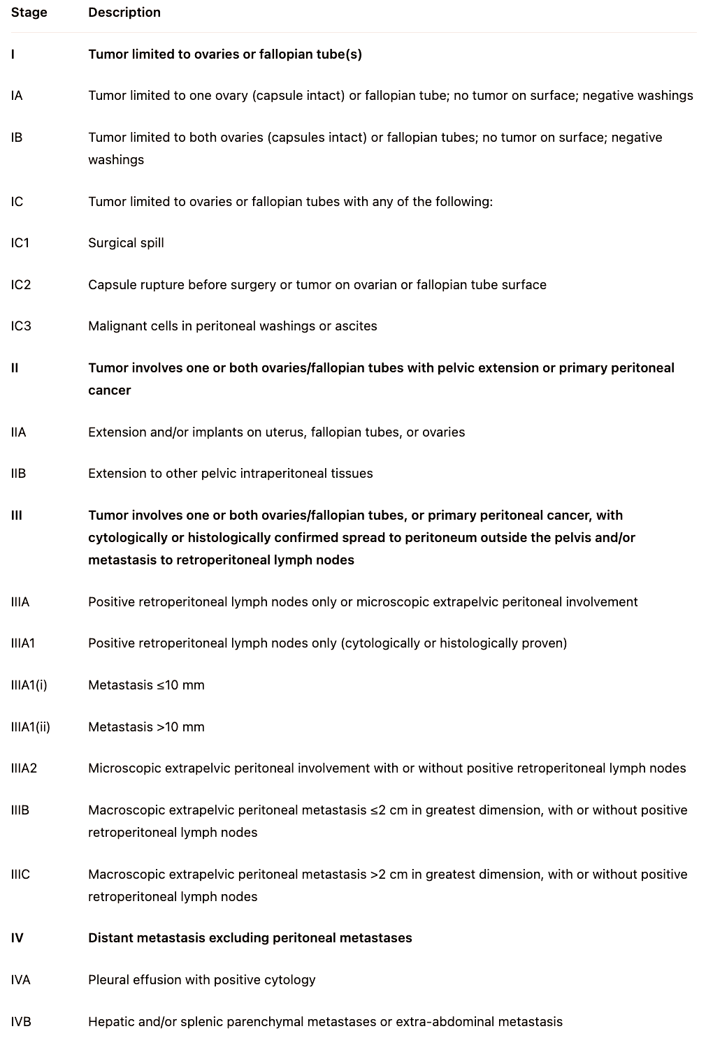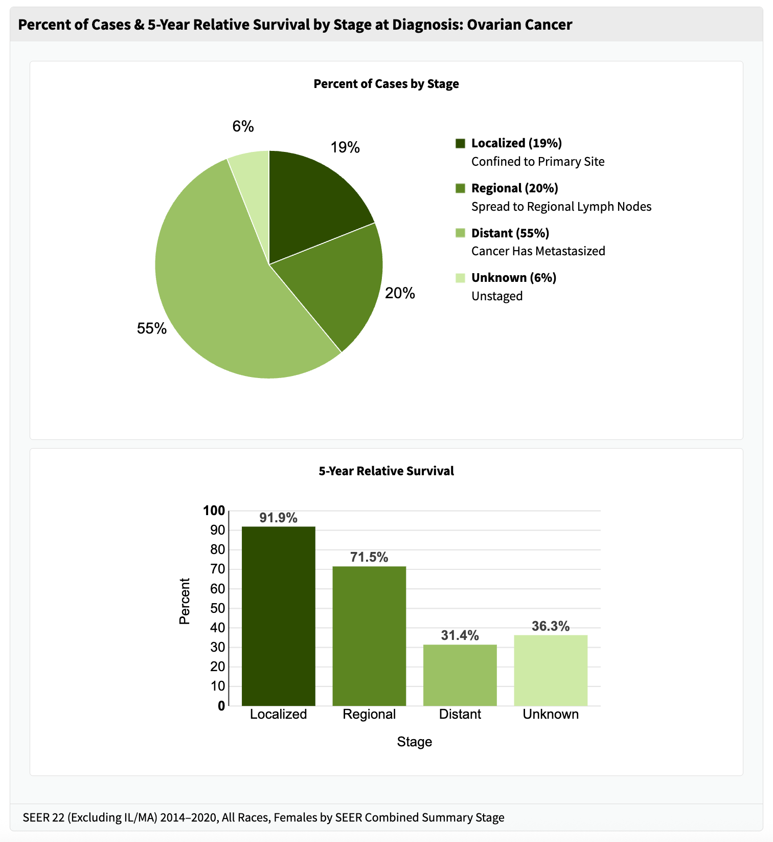 Ovarian Cancer: Staging and Survival Last updated on Apr 12, 2025 Photo by Ahmed Zayan / Unsplash 2019 FIGO Staging of Ovarian CancerSurvival Statistics (SEER Website - As of April 2025) Next Surgery First or Chemo First